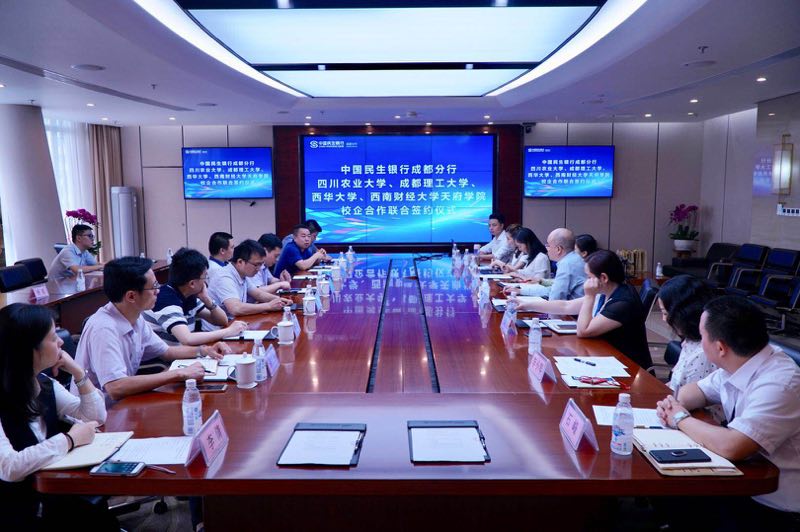 6月29日下午,冰球突破mg正规官网副书记何仁辉、经济系副系主任郑勇、办公室主任姚霞一行赴民生银行成都分行开展交流合作,与该行签订了教学实践基地协议,民生银行唐立斌副行长及人力资源部、团委等多个部门负责人出席了座谈会。