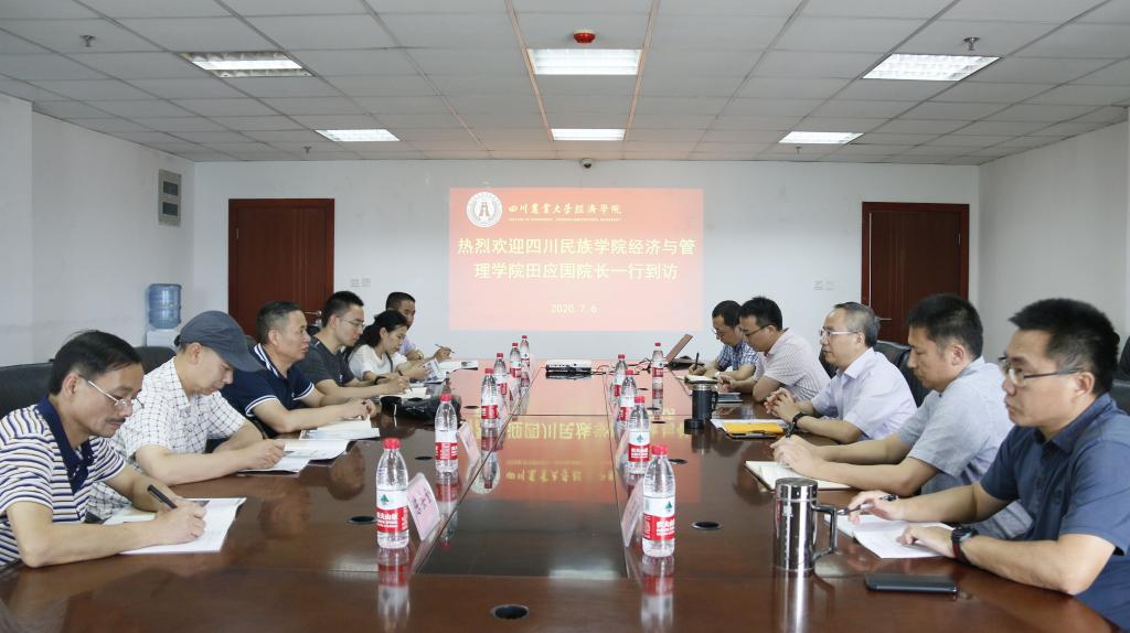 7月6日下午,四川民族学院经济与管理学院院长田应国、党总支书记周德荣一行六人到冰球突破mg正规官网考察交流。冰球突破mg正规官网院长蒋远胜、副院长吴平、党委副书记何仁辉、金融系主任臧敦刚、经济系主任曹正勇等参会,会议由蒋远胜主持。