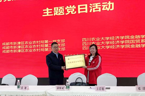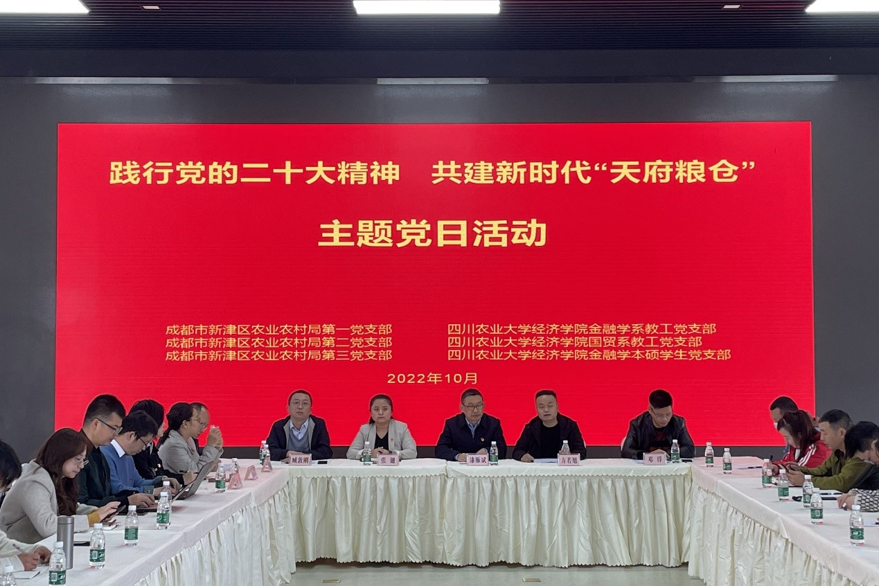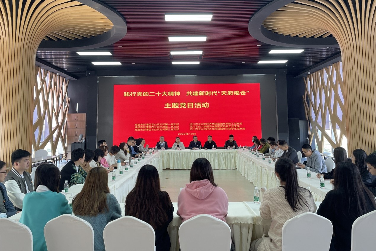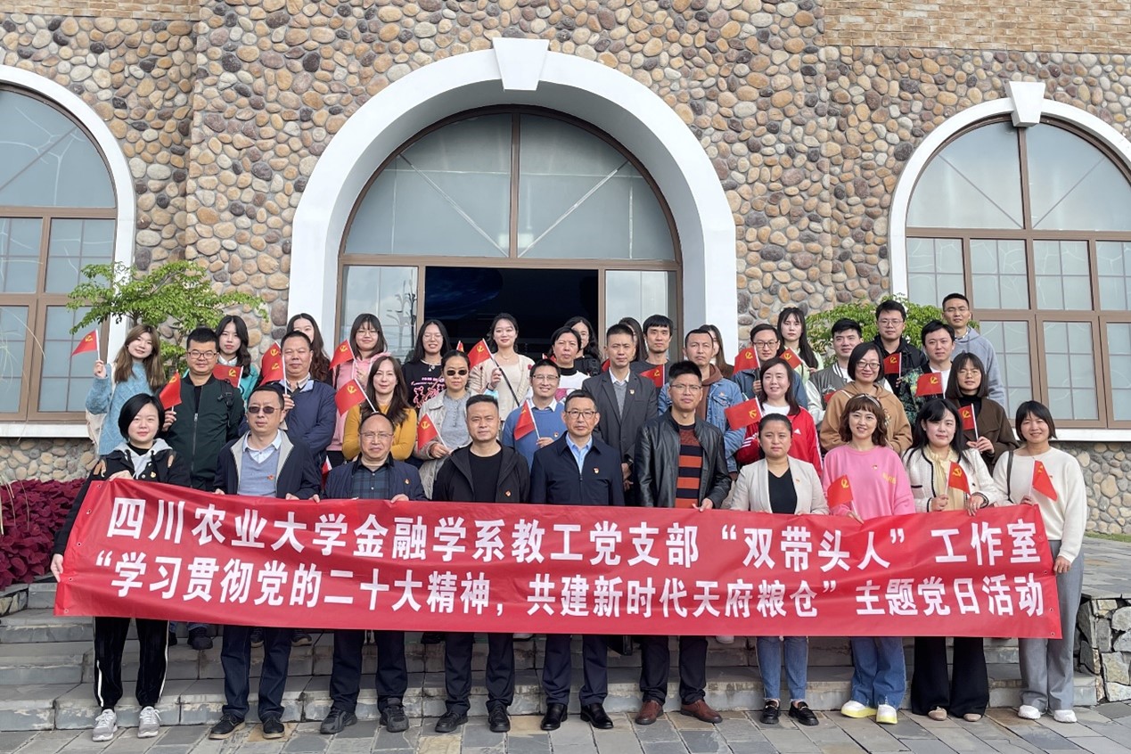 10月30日,在学院党委书记漆雁斌教授的带队下,金融学系教工党支部“双带头人”工作室、国际经济与贸易教工党支部、2021级应用经济学与林业经济管理硕士研究生党支部、金融学本科生第一党支部、第二党支部等五支部一行30余人前往新津区天府农博园,与成都市新津区农业农村局第一党支部、第二党支部、第三党支部联合开展“学习贯彻党的二十大精神,共建新时代天府粮仓”主题党日活动。学院党委副书记、纪委书记张翅以普通党员身份参加活动,致公党党员康明惠博士列席活动。