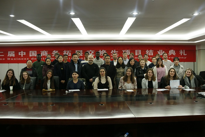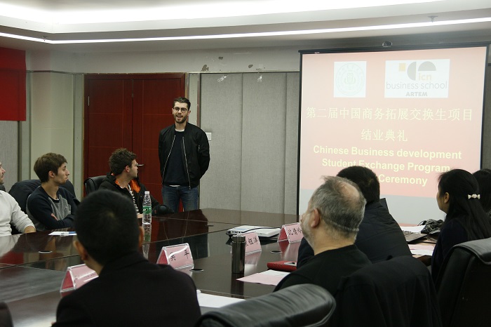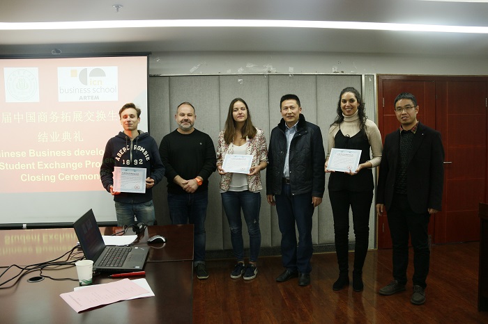 典礼上,Gérald Duffing、刘涛、吴平分别为法国交换生颁发中国商务拓展项目结业证书。