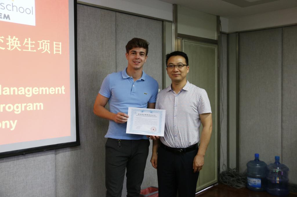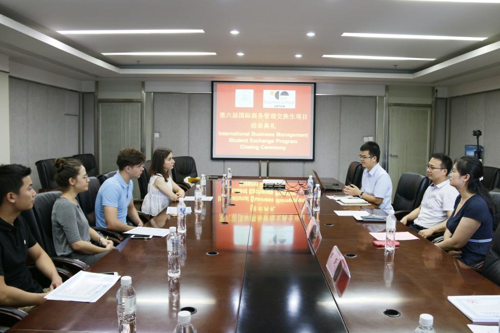 7月10日下午,冰球突破mg正规官网第六届“国际商务管理”交换生项目结业典礼在一教305会议室举行。学院副书记何仁辉、国际经济与贸易副系主任宋涛、法国南锡高等商学院驻中国办事处主任康钰洋以及法国交换生参加了此次典礼。结业典礼由宋涛主持。