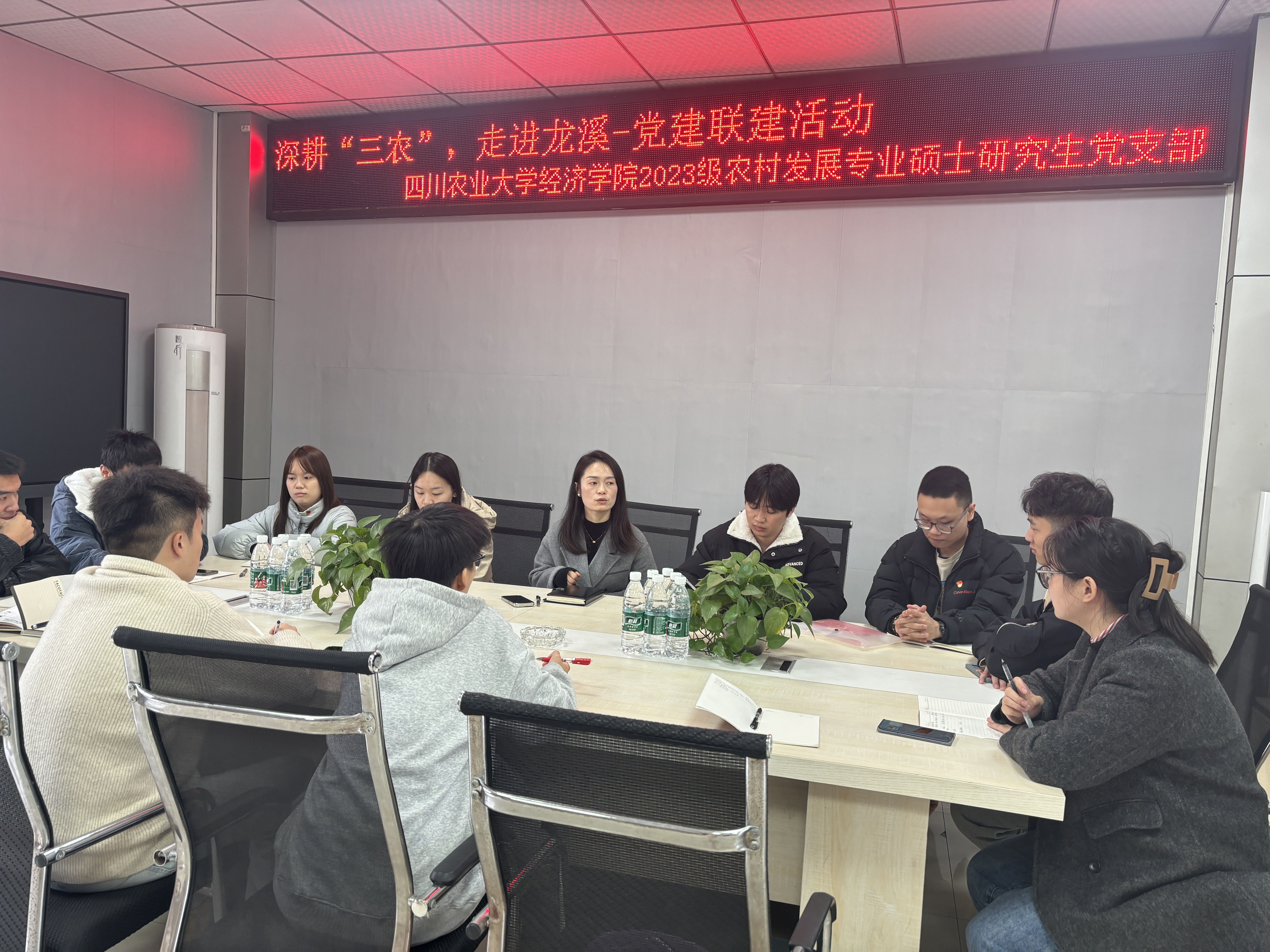 活动在龙溪村村委会会议室以座谈会形式拉开帷幕。会议围绕习近平总书记来川视察重要指示精神展开交流学习,习近平总书记强调作为“天府之国”的成都平原,在推进乡村振兴上要全面发力,守好耕地红线,推进农业现代化建设,积极发展绿色农业、生态农业、高效农业,在新时代打造更高水平的“天府粮仓”。座谈会上,龙溪村村党委委员介绍了龙溪乡村振兴示范走廊的基本情况和党建引领乡村振兴经验做法,表示希望通过继续加强校地合作和志愿服务,率先走出一条体现龙溪特色、服务带动全局的农业农村现代化之路。两支部党员同志们聚焦“农业高质高效、乡村宜居宜业、农民富裕富足”进行探讨,我校研究生党员代表袁陈林同志结合专业知识谈到,龙溪村的特色农产业,要在坚守 18 亿亩耕地红线的政治使命引领下,积极应变求新,培育发展新型农业经营主体,打造龙溪“研学基地+生态康养+创意农业”为一体的现代农业产业园。通过热烈的交流研讨,全体党员进一步明确了新时代“三农”工作的历史使命与责任担当,深刻认识到党员在乡村振兴伟大实践中的先锋模范作用。