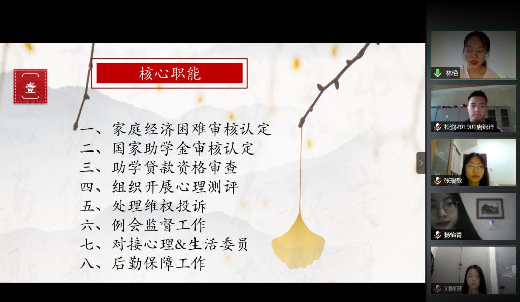 2020年8月16日8:00-21:50,冰球突破mg正规官网第六届学生团体联合会主干培训的首场培训会顺利举行。学院全体辅导员和全体主干共计99人参加线上培训,出席会议的还有学院重点扶持的金融投资协会、计量经济协会、商业银行协会、保险协会、模拟联合国协会、演讲与口才协会6个协会。