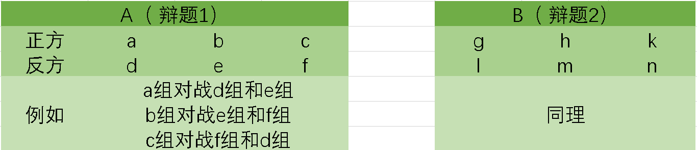 初赛: 12个班级分为A、B两个大组,每个组各含6个班,两个组采用不同辩题。各组中正方有3支队伍,反方有3支队伍。任意持方的每支队伍都会与相对持方的其中两支队伍进行比赛,最终将每支队伍积分进行加总,采取积分淘汰制的原则,每组积分最高的两支队伍晋级半决赛。