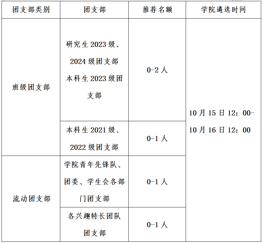 各支书于10月15日(下周二)晚上22:00之前将支部拟推荐申请人、曾被支部推荐但未被学院最终推选的入团申请人(本次所获同意票需超过二分之一)所填写的附件1汇总后以支部命名发送至组织部邮箱2472377842@qq.com。