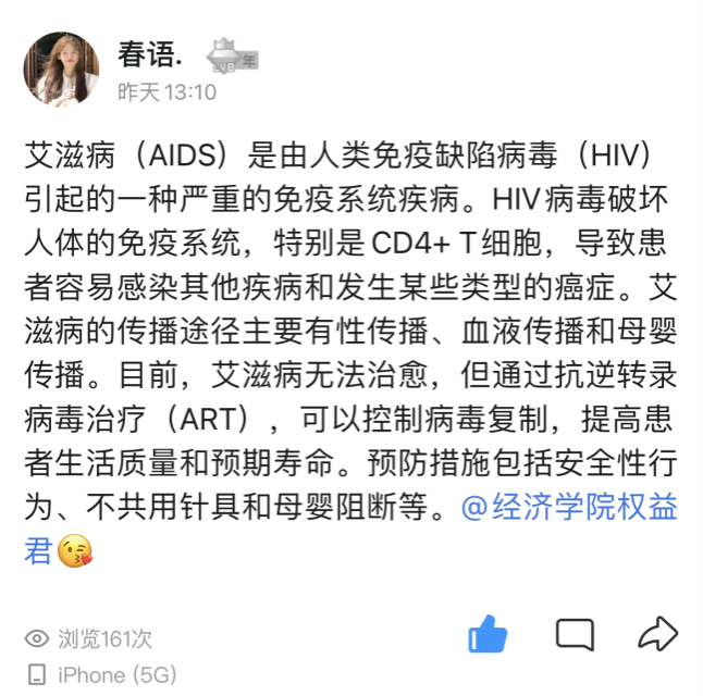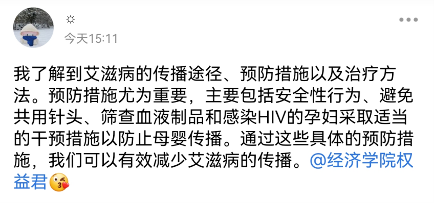 本次活动以线上学习平台为载体,鼓励同学们自主学习HIV的相关知识,并将学习成果与学习心得分享到QQ空间,形成良好的互动氛围。这种形式不仅提高了同学们对艾滋病的科学认知,也扩大了防艾知识的传播范围,打破了以往对艾滋病的认知误区。随着活动的深入,同学们热情高涨,纷纷交流防艾心得、探讨预防措施,自我保护意识得到显著提升,进而营造了一个更加包容、安全的校园环境,传递出关怀与健康的正能量。