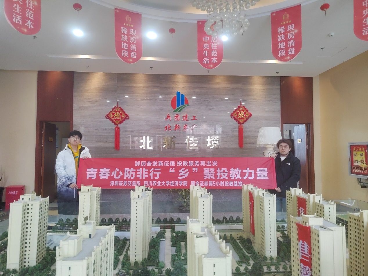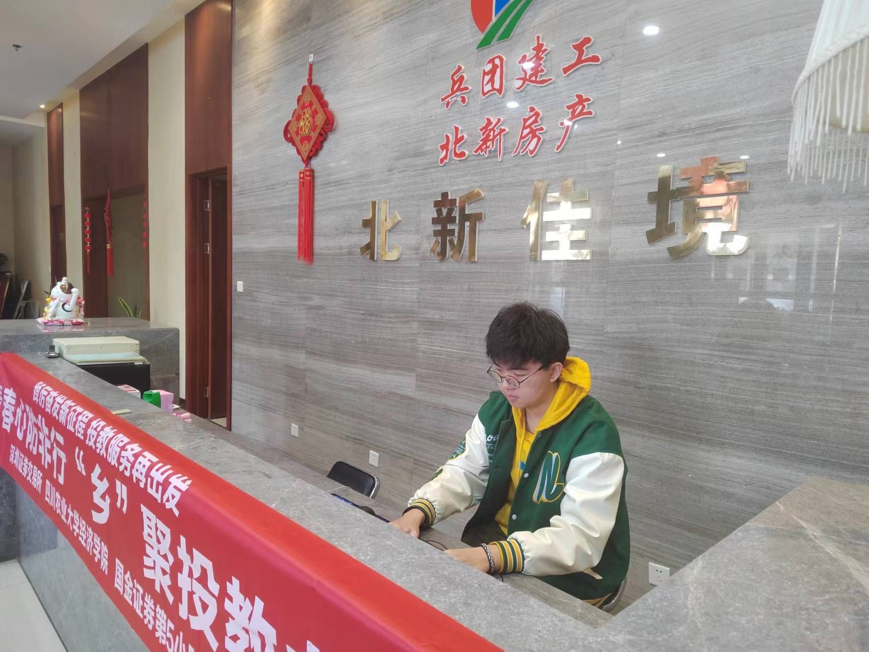 图为实践团队队长牛博文向兵团建工北新房产销售团队成员介绍国金证券业务
