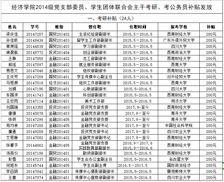 冰球突破mg正规官网团委拟对2014级现任或曾任党支部委员、学生团体联合会主干(需任满一届)考研、考公务员补贴,预算1万元,超过则打折发放。补贴发放规则如下: