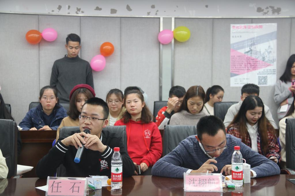 张力文提及的重点是社会实践。张力文学长结合自身实践经历,说明了社会实践的辛苦和障碍,给同学们普及了社会调研的相关知识。张力文针对同学提问说明了社会实践项目的申报过程,对家庭金融的调研活动题除了看法。