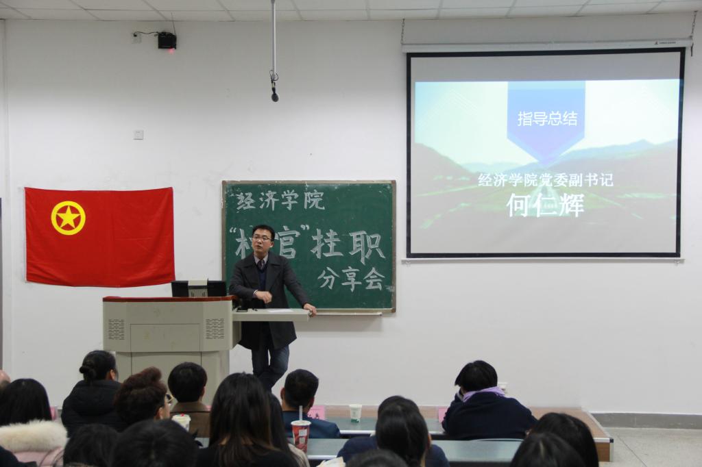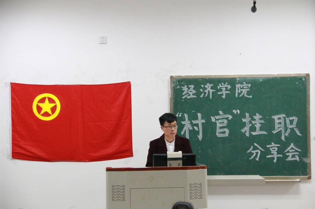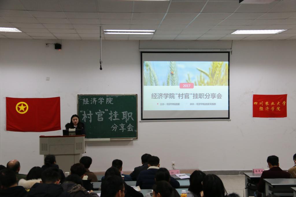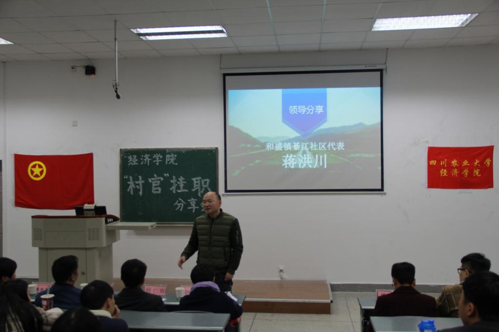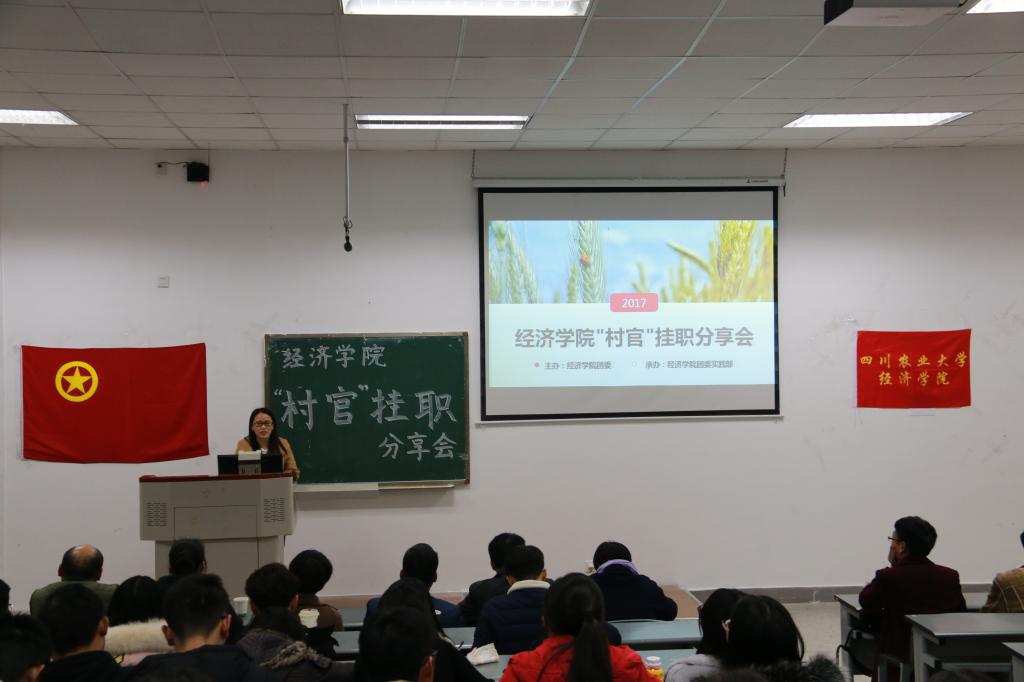 为展示2017年暑期“村官”挂职社会实践活动成果,并促进经院学子对“村官”挂职暑期社会实践活动的进一步了解。12月5日晚上19:00,由冰球突破mg正规官网团委主办,冰球突破mg正规官网团委实践部承办的暑期社会实践“村官”挂职分享交流会在第四教学楼A108举行,本次分享会冰球官网邀请温江区公平街道惠民社区党委书记官蓉,温江区公平街道惠民社区党委副书记张杰,温江区万春镇洪桥区村主任周澄清,温江区合盛镇铁篱村村主任何仁斌,温江区合盛镇綦江社区蒋洪川等嘉宾来参加。学院党委副书记何仁辉,学院团委书记钟贝也参加了该分享会。