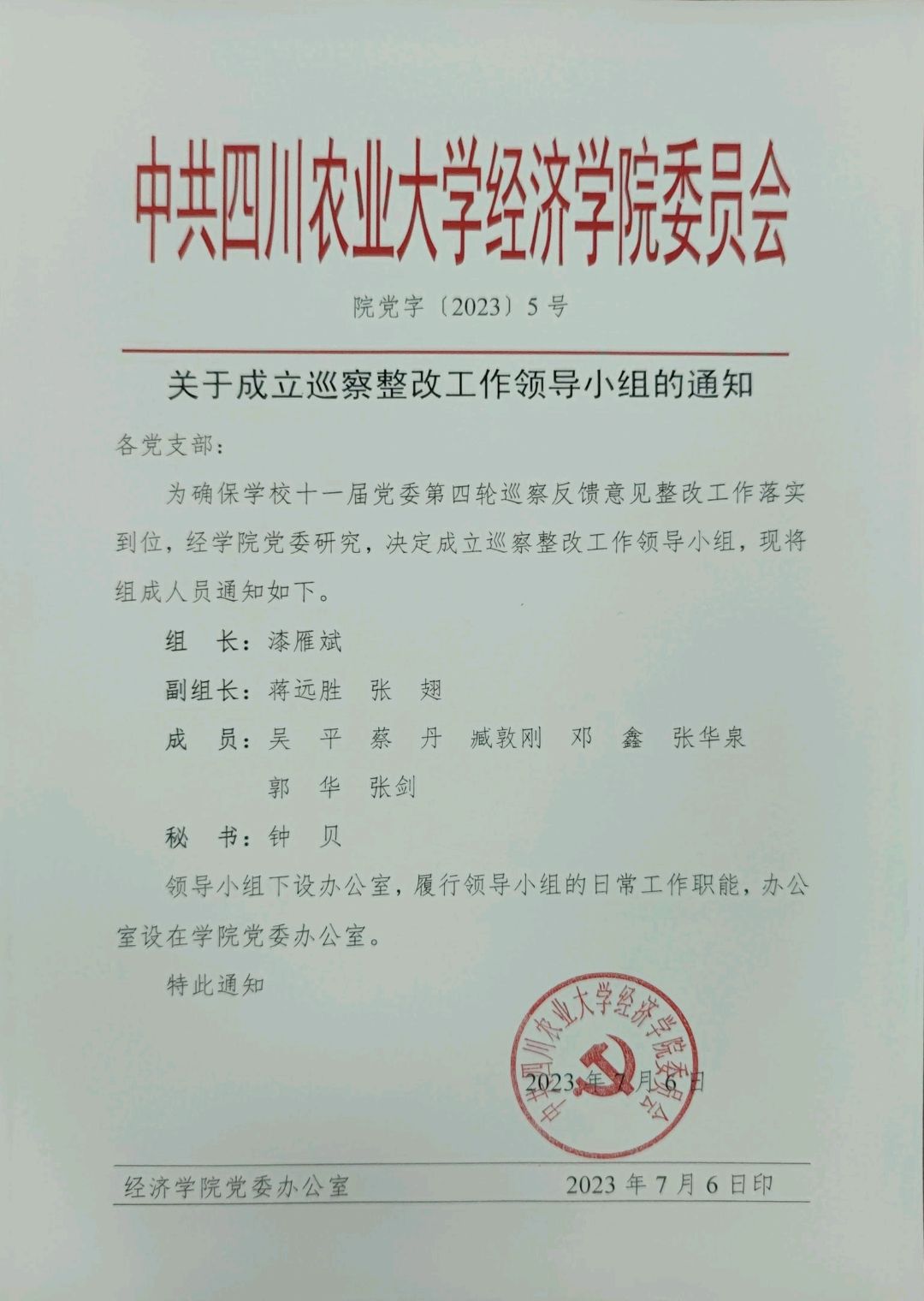 院党字〔2023〕5号——关于成立巡察整改工作领导小组的通知