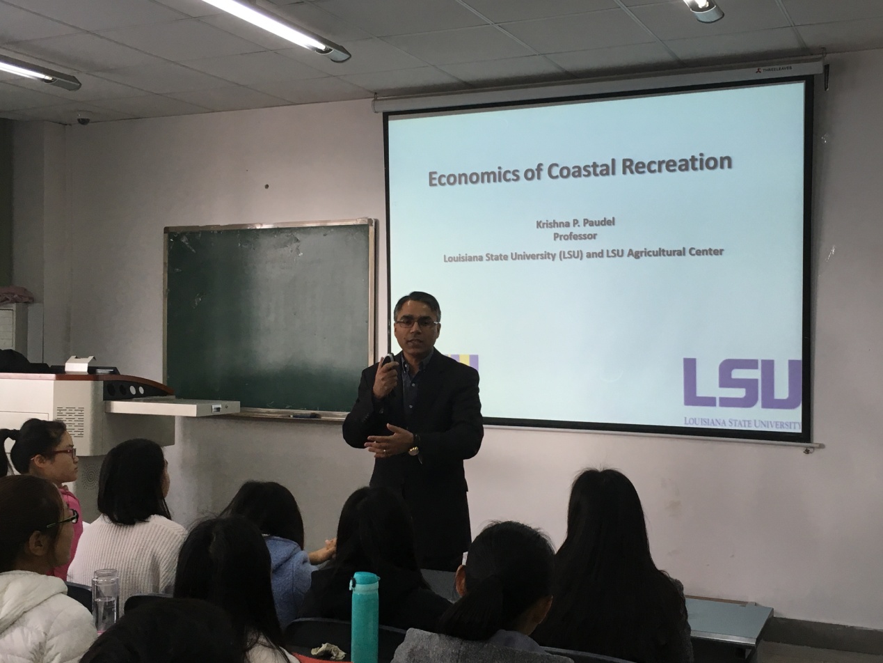在学术讲座中,Paudel教授向同学们展示了美国路易斯安娜州的海滨风貌,指出路易斯安娜州正面临着严峻的湿地面积缩减问题。随后Paudel教授分享了其在SSCI索引期刊发表的文章,题目分别为“开辟新的公共娱乐区以振兴海边社区和保护自然资源----来自路易斯安娜州Elmer岛的案例”、“海边娱乐活动选择的影响因素评估”以及“游客对淡水娱乐设施特征的选择偏好—来自美国家庭调查的启示”。Paudel教授以通俗易懂的讲授方式向大家讲解了多种经济学研究方法,并在提问环节热情地与大家进行互动,引起现场阵阵热烈的掌声。在讲座即将结束之际,Paudel教授还向在座的同学们仔细讲解了路易斯安娜州立大学申请要求与申请步骤,并鼓励有意愿的同学积极提交申请。