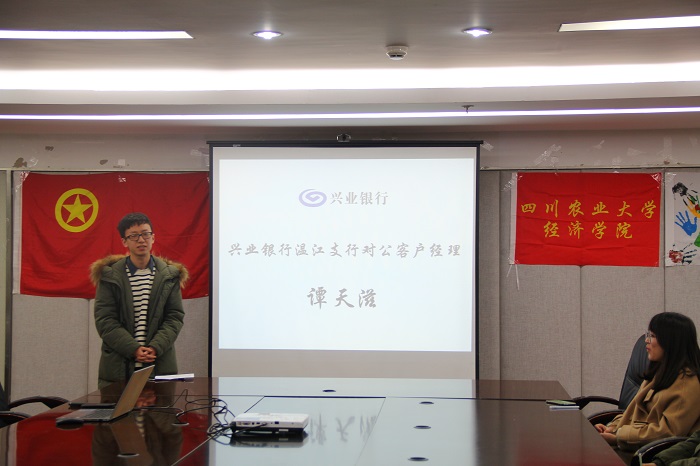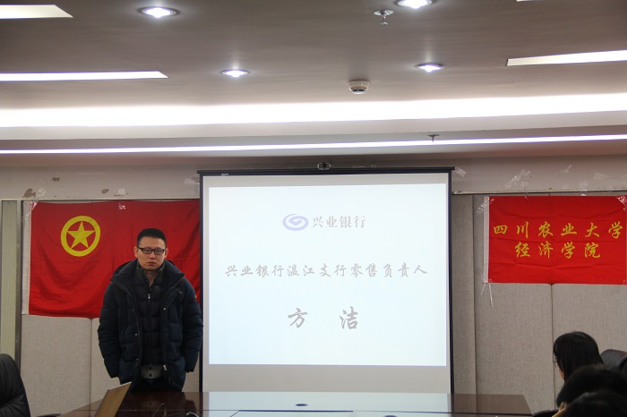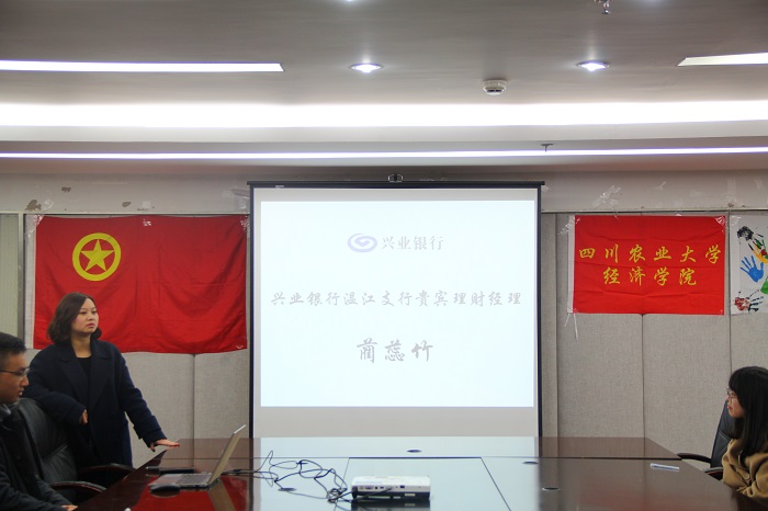 12月21日,冰球突破mg正规官网在1教408会议室举办兴业银行专场实习交流会。兴业银行温江分行零售负责人方洁、贵宾理财经理蔺蕊竹、对公客户经理谭天滋、贵宾理财师刘芊莅受邀莅临座谈会。学院党委副书记何仁辉、团委书记兼党委办公室副主任钟贝和对兴业银行有从业志向的同学参加会议。