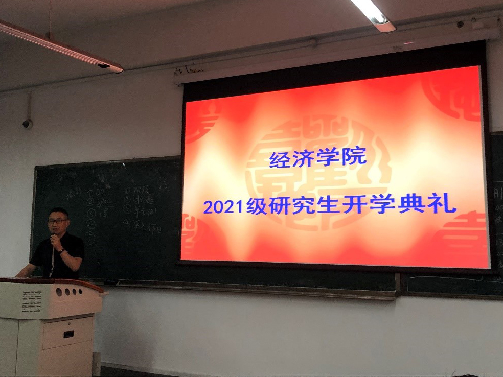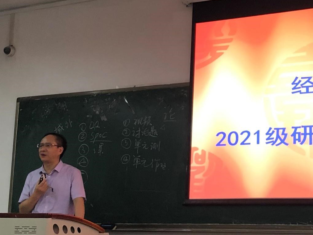 首先,蒋远胜代表学院对2021级研究生新生表示诚挚的祝贺和热烈的欢迎,对冰球突破mg正规官网的发展历史、师资力量和科研成果作了简要介绍。对于研究生学习生涯,蒋远胜院长提出3个关键词:研究、沉思、实证。也以“学而不思则罔,思而不学则殆”寄语新生们要多思考,希望新生们秉承“厚德博学,经世济民”的院训,砥砺前行。最后用马克思的格言勉励各位:“在科学的道路上没有平坦的大路可走,只有崎岖小路上不畏劳苦的人才有希望到达光辉的顶点。”