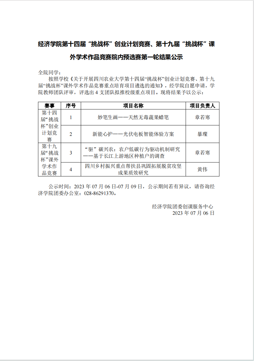 冰球突破mg正规官网第十四届“挑战杯”创业计划竞赛、第十九届“挑战杯”课外学术作品竞赛院内预选赛第一轮结果公示