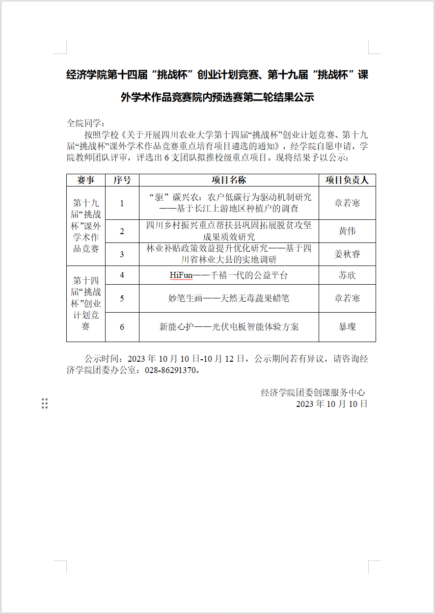 冰球突破mg正规官网第十四届“挑战杯”创业计划竞赛、第十九届“挑战杯”课外学术作品竞赛院内预选赛第二轮结果公示
