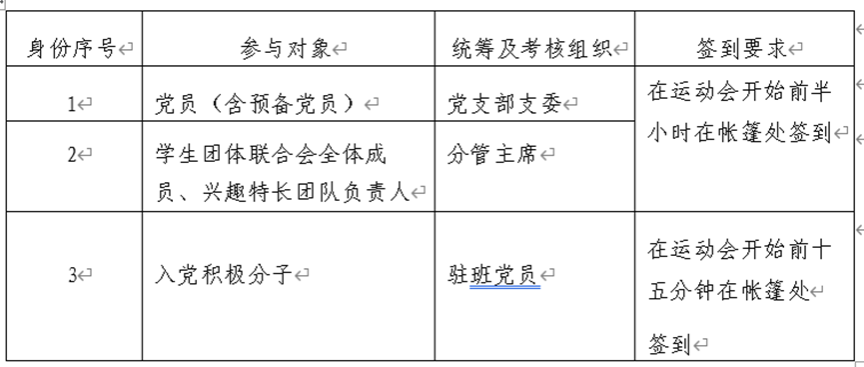 1.各统筹及考核组织负责考勤考察(签到与签退)和现场组织工作,要求提前到达学院帐篷。(注:校运会举办分上午场和下午场,各位同学均需提前到达。)