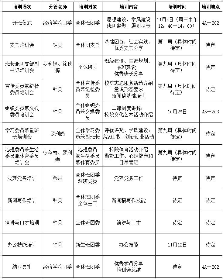 1.本次团校培训开班仪式与结业典礼由组织部和学办负责,其余场次对接会具体事宜由各部门自行安排。
