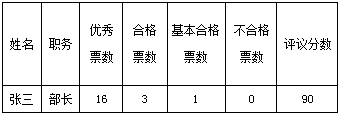 一票“优秀”记5分,一票“合格”记3分,一票“基本合格”记1分,一票“不合格”记0分。再除以总分(有效测评票数乘以“优秀”的分数),得到评议结果分数。