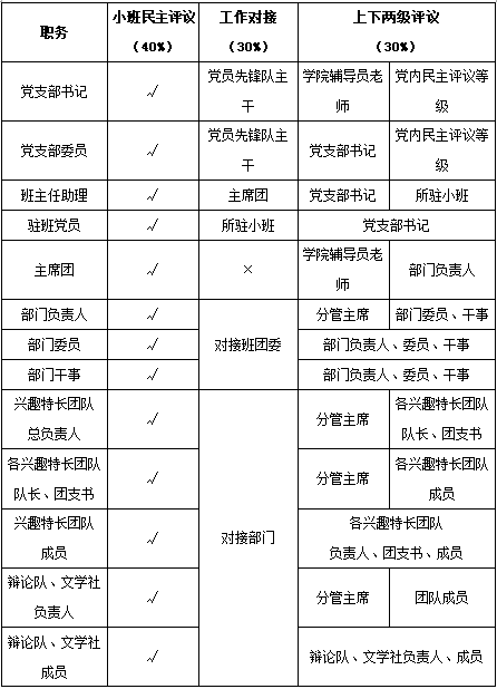 2.对接班团委、部门根据工作指导、工作责任心等进行评分并获得相应考核等级。