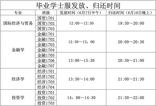 (三)借还时间:请各小班班长按照各班分配时间于6月7日中午领取、6月10日晚上归还学士服。