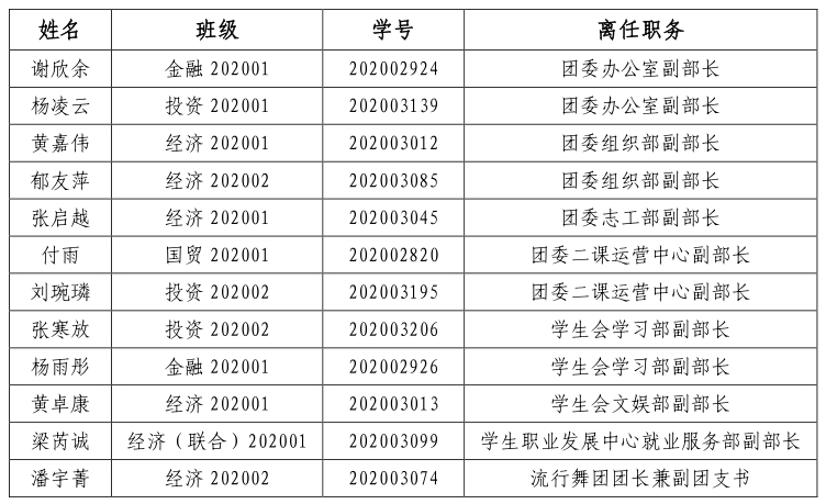 根据《学生干部培养管理办法(试行)》(院团字[2020]8号)规定,冰球突破mg正规官网第七届学生团体联合会部分主要学生干部因个人原因离任,现公示如下: