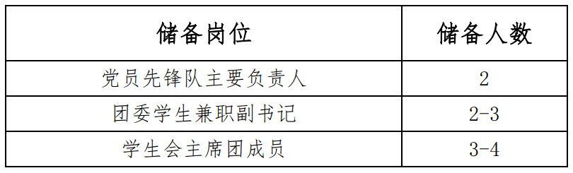 学院设立学生团体联合会,包含党员先锋队、团委、学生会三大系统。储备人选将作为主席团成员后备人选重点考察对象进行考察和培养。结合各系统工作实际,储备人选岗位及储备人数(不超过规定人数)详情如下:
