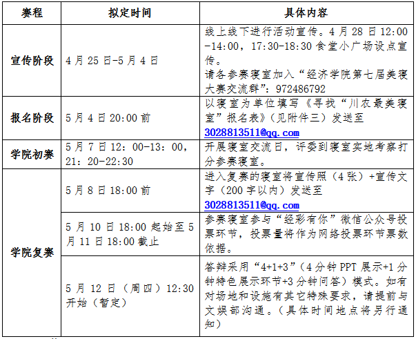 (四)各参赛寝室需严格按照时间节点开展工作,其他未尽事宜另行通知。如有疑问,可联系文娱部周俊帆(QQ:1304704139)、文娱部何俊桦(QQ:1399804019)、文娱部张嘉益(QQ:1019343987)、学生会杨卓妍(QQ:2320466559)。