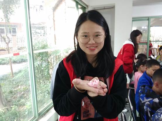 其中一个小朋友更是用她自己的巧手制作出了五六朵桃花,并把一些桃花分给了在座的其他小朋友们。其中两个志愿者也收到了她的桃花,这份浓浓的情意直击志愿者的心灵。“你对我好,我也对你好”这大概就是小朋友们最直接的表达方式。