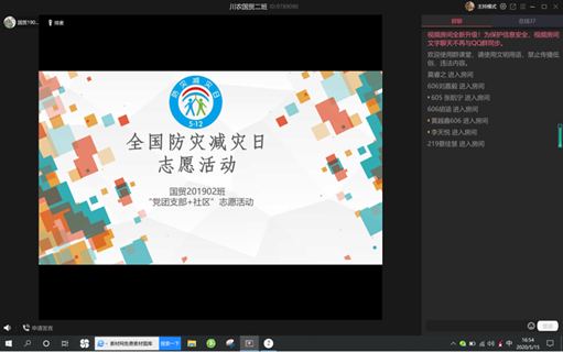 为了让同学们了解更多的防灾减灾相关知识,以更加专业的态度为社区居民进行服务,国贸201902支部于5月15日提前在支部内召开了一次“全国防灾救灾日”志愿活动宣讲会。宣讲会中,主持人首先介绍了全国防灾减灾日的由来,以及举办防灾减灾志愿活动的重要性。紧接着,主持人以地震、火灾以及气象灾害三个常见的灾害为核心,用播放新闻、科普影片以及展示图片的形式,给同学们讲解了如何科学地进行防灾减灾避灾。在同学们了解了相关知识后,本次宣讲活动也迎来了尾声——介绍社区活动的安排以及进行支部模拟答题。在本环节中,同学们对主持人介绍的社区活动安排纷纷表示赞同,同时也积极参与了活动负责人安排的模拟答题。模拟答题后,支部副书记收集了同学们为社区所出的题目,并最终制成了一份社区知识问答卷。