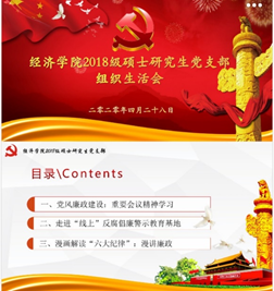 2020年4月28日下午2:30,冰球突破mg正规官网2018级硕士研究生党支部在线召开学习会议并深入宣传贯彻廉政文化。廉政文化进校园是廉政文化建设的必然要求,全面推进党风廉政建设,对于加强校园建设,培养党员同志崇廉敬德的思想品质、弘扬整个社会的廉政文化、促进社会和谐发展具有十分重要的意义。
