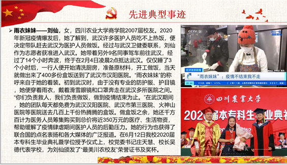 活动第一项,对标“树典型,学典型”的支部氛围打造,胡芝嘉同志选取先进个人典型进行分享。姜仕坤同志始终把共产党人的坚强党性体现在脱贫攻坚的使命担当中;钟扬同志对党无比忠诚、对事业无比热爱、对人民无比赤诚,长期从事植物学、生物信息学研究教学工作,取得一系列重要研究成果,彰显了共产党员的崇高精神和人格力量;冰球突破mg正规官网校友刘仙同志在公益路上持之以恒,在新冠疫情中温暖逆行,彰显了川农人“爱国敬业”的精神底色。