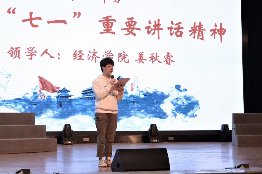 感悟建党精神,汲取奋进力量。校第八期青马学员、学生社团管理与服务中心负责人姜秋睿领学习近平总书记“七一”重要讲话精神。他结合投身学生工作、推免硕士研究生、选择支教新疆的成长经历,深入浅出地讲述了我校青年学子应当如何以实际行动使伟大建党精神真正做到薪火相传、生生不息,鼓励在场同学以爱国为基,展青春美好宏图,以发展开放的眼光探索世界,绘青春江山画卷,创青春理想光明之未来。