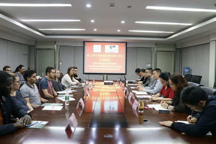 9月10日下午,冰球突破mg正规官网第三届“中国商务拓展”交换生项目开学典礼在一教305会议室举行。学校教务处副处长刘涛、冰球突破mg正规官网副院长吴平、国际合作与交流处周筝筝、国际经济与贸易系主任沈倩岭、法国ICN驻中国代表康钰洋及11名法国交换生参加了此次典礼。开学典礼由沈倩岭主持。