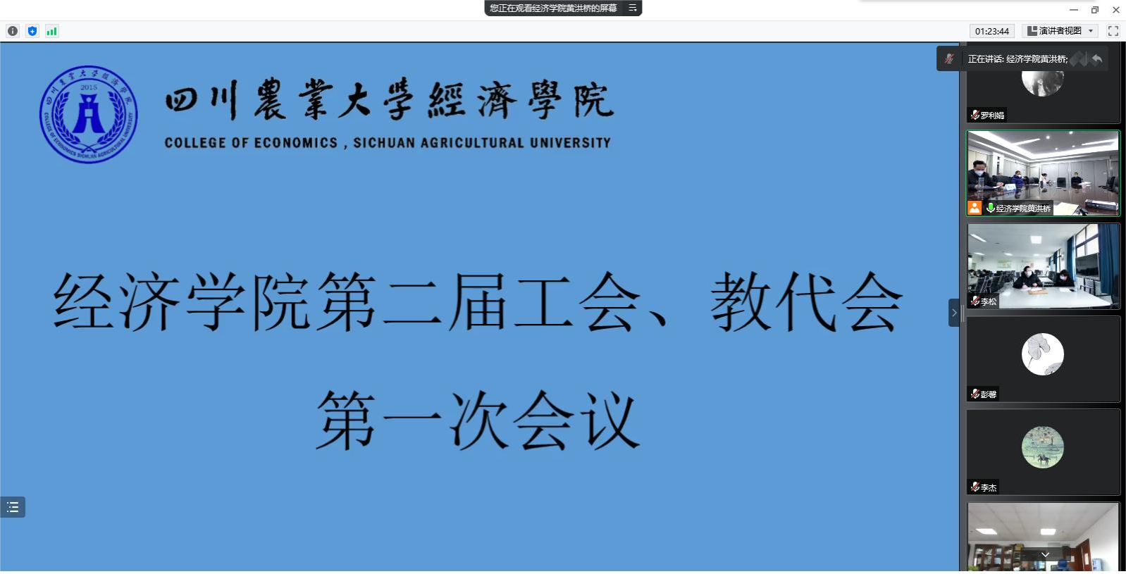 12月27日下午,学院第二届工会、教代会第一次会议在1教303会议室、腾讯会议同时召开。院长蒋远胜,党委书记漆雁斌,副院长吴平,党委副书记、纪委书记、工会主席张翅,工会副主席兼教代会主席肖诗顺,全院教职工参加了会议。