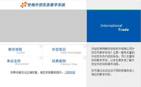 世格外贸实务教学系统可丰富教学手段,让学生更多了解外贸业务的实际操作流程、其中涉及的单据的作用、格式和内容,使学生真正具有高素质的工作能力。教学系统主要分教学课程、外贸尝试、单证全库、经典案例四个部分。