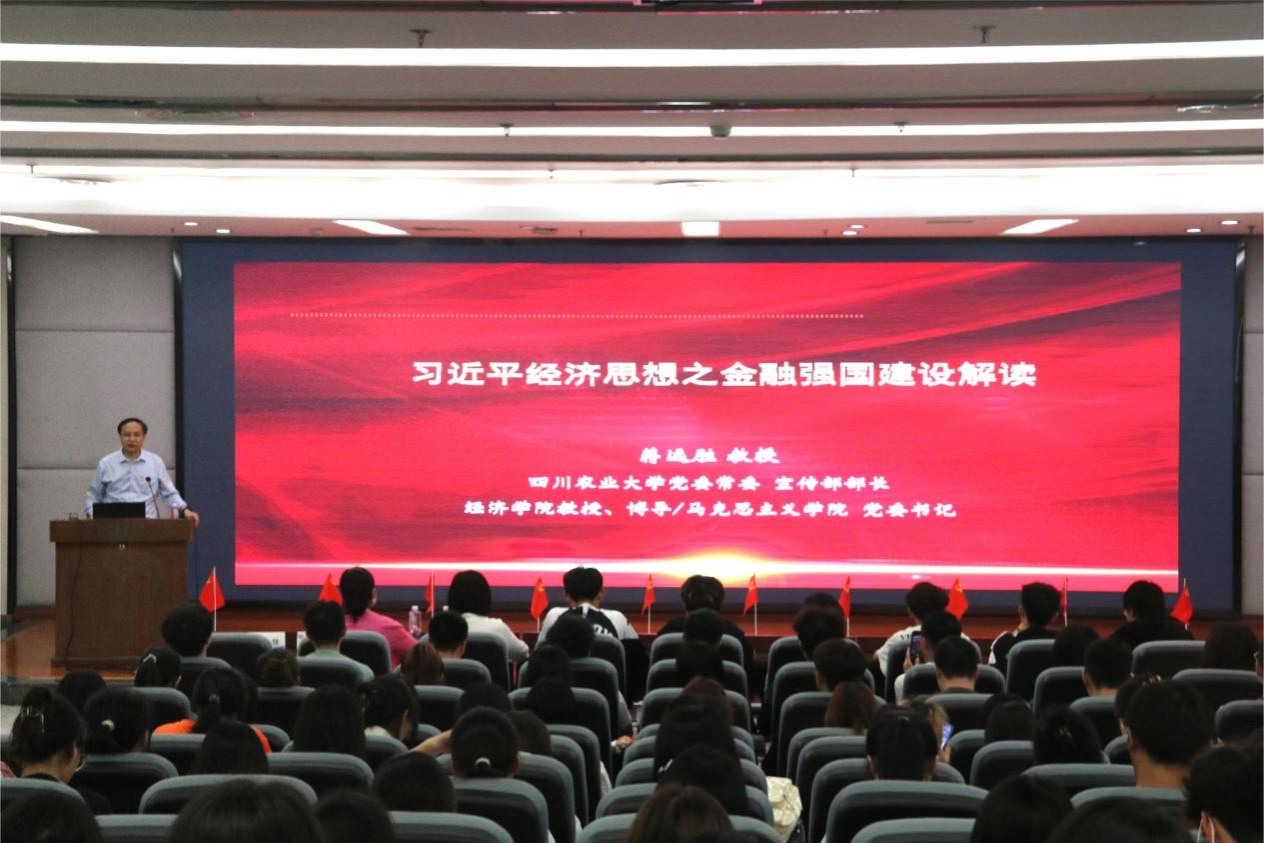 报告会上,蒋远胜围绕从金融与经济之间的关系入手,从“什么是金融强国”“怎样建设金融强国”两个问题着手,结合翔实的数据和生动鲜活的案例习近平经济思想之金融强国建设中提出的6个强大6大体系”“8个坚持等版块的内容进行深入浅出地解读和分享也进一步阐明金融与经济共生共荣的关系以及加快建设金融强国的目标与路径。在场师生纷纷表示受益匪浅。蒋老师叮嘱师生们提高政治站位,胸怀“国之大者”,一定要把党的创新理论学习与学科的研究实践有机结合,在加强金融科技创新和金融人才培养等方面科学谋划、主动作为,通过不断加强金融政策和金融安全学习和研究,切实把党中央的决策部署转化为学院的具体举措和同学们的专业实践,努力为推动金融强国建设提供川农师生力量。